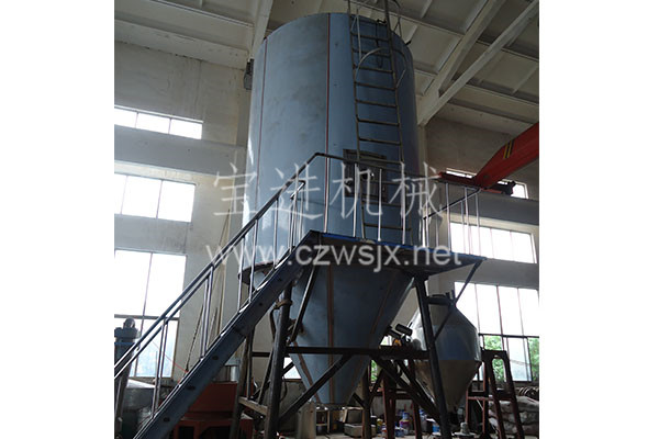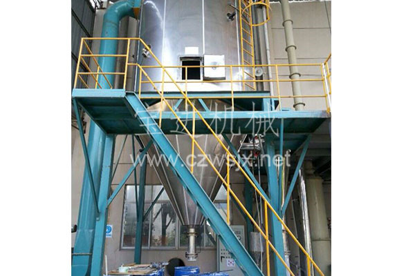 空氣經(jīng)過過濾和加熱,進(jìn)入干燥器頂部空氣分配器,熱空氣呈螺旋狀均勻地進(jìn)入干燥室。料液經(jīng)塔體頂部的高速離心霧化器,(旋轉(zhuǎn))噴霧成極細(xì)微的霧狀液珠,與熱空氣并流接觸,在極短的時(shí)間內(nèi)可干燥為成品。成品連續(xù)地由干燥塔底部和旋風(fēng)分離器中輸出,廢氣由風(fēng)機(jī)排空。